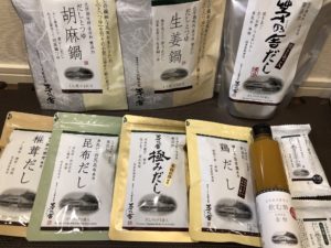 中身はこちら。ごま鍋、生姜鍋の素、茅乃舎だし、椎茸だし、昆布だし、極みだし、鷄だし、飲む酢(金柑)、だし巻き玉子の元2個。