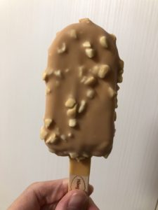 バタースカッチのアイスに塩キャラメルのソースが入っていて、マカダミアナッツ入りのチョコレートでコーティングされている…