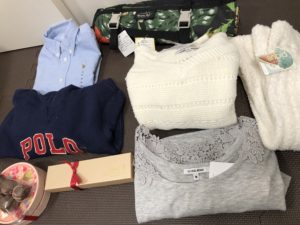 ラルフローレンの子供服2点、私の服2点、ジェラートピケのレッグウォーマー、ノースフェイス のリュック、レジャーシート、GODIVAのチョコ、リンツのチョコ。
