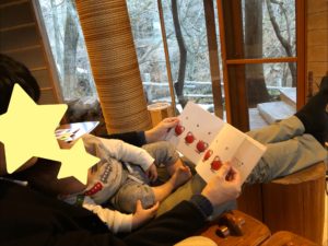 暖炉の前で絵本を読んで貰って嬉しそうなウェウェちゃん。