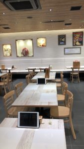 注文は席のタブレットで注文して、お会計はレジで行います。ベビーカー入店もOKキッズチェアもあります。
