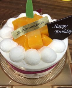 イチゴのケーキ、マンゴーとパイナップルケーキ、チョコレートケーキがありましたが最近マンゴーの美味しさに気づいたウェウェちゃんのために夫がマンゴーをチョイス。