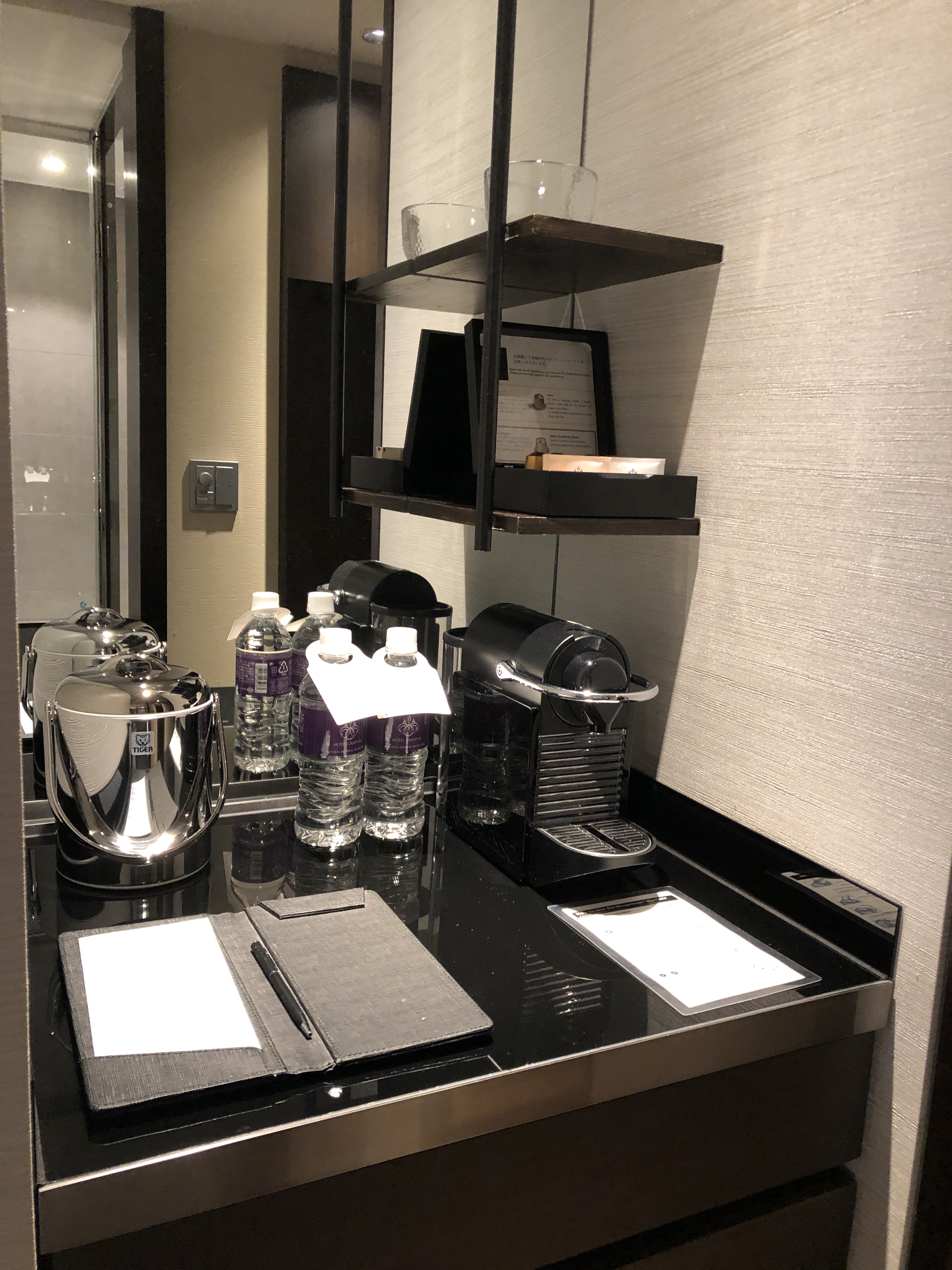 お部屋にはネスプレッソとミネラルウォーター、緑茶、ほうじ茶が無料。冷蔵庫のミニバーは有料でした。