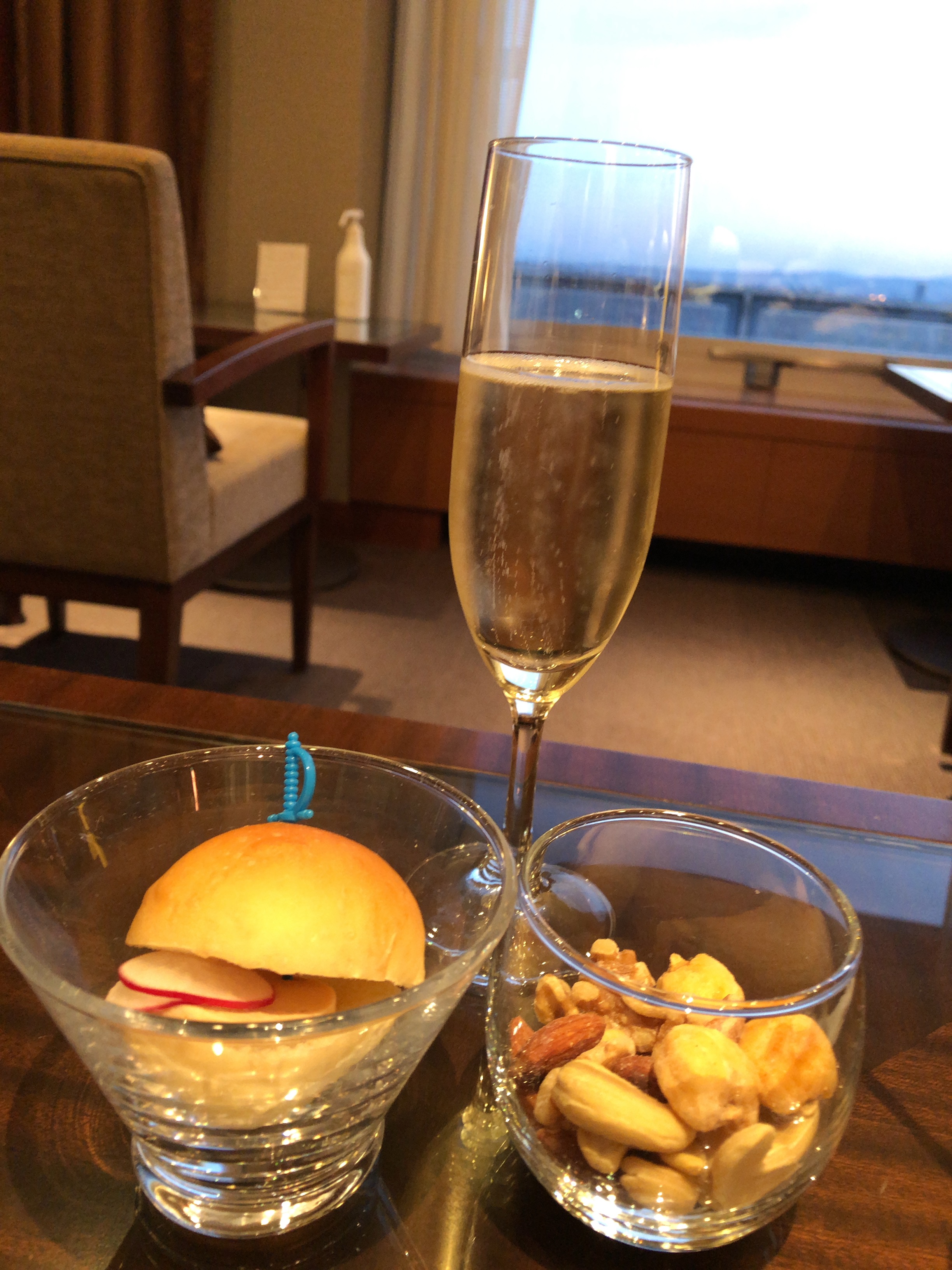 17-20時まではラウンジで赤ワイン、白ワイン、シャンパンとおつまみの提供があります。