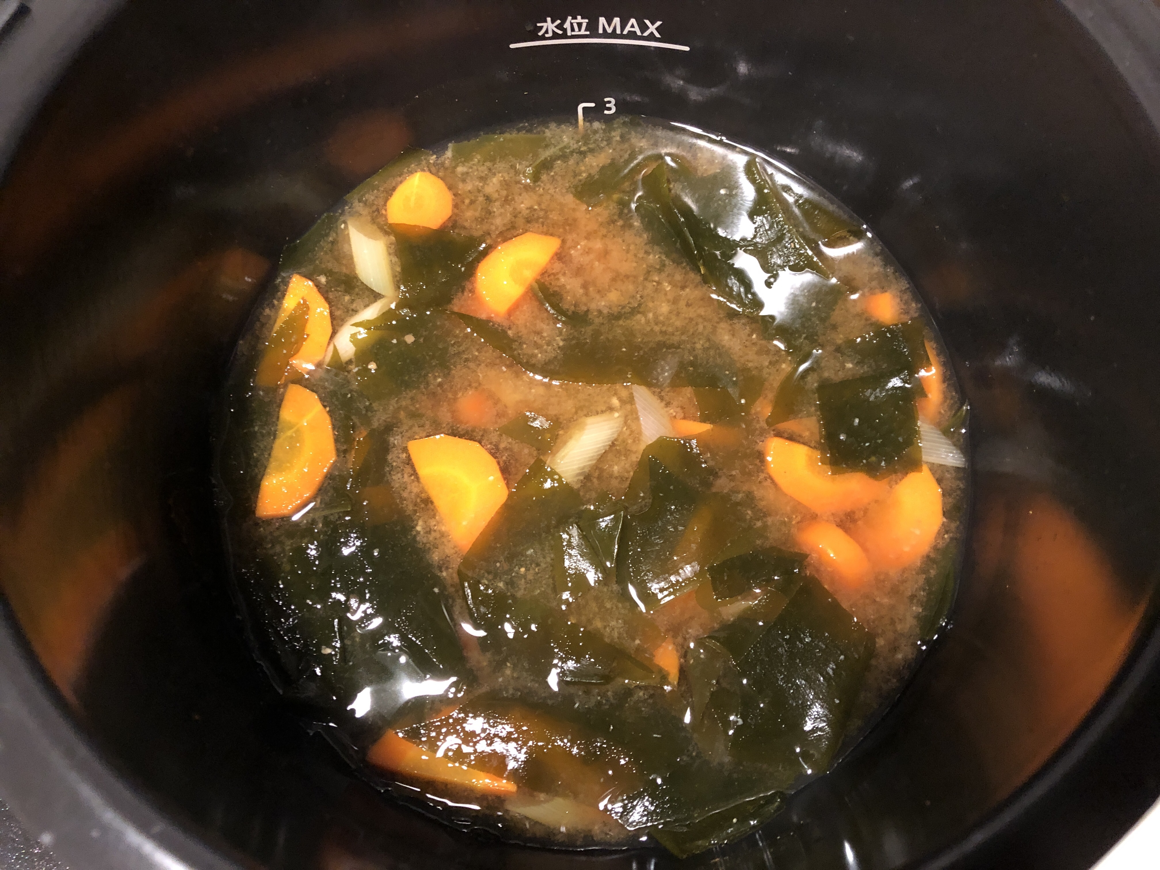 茅乃舎のだしと適当な野菜と娘の好物のわかめを入れて味噌汁モードでスイッチオン!