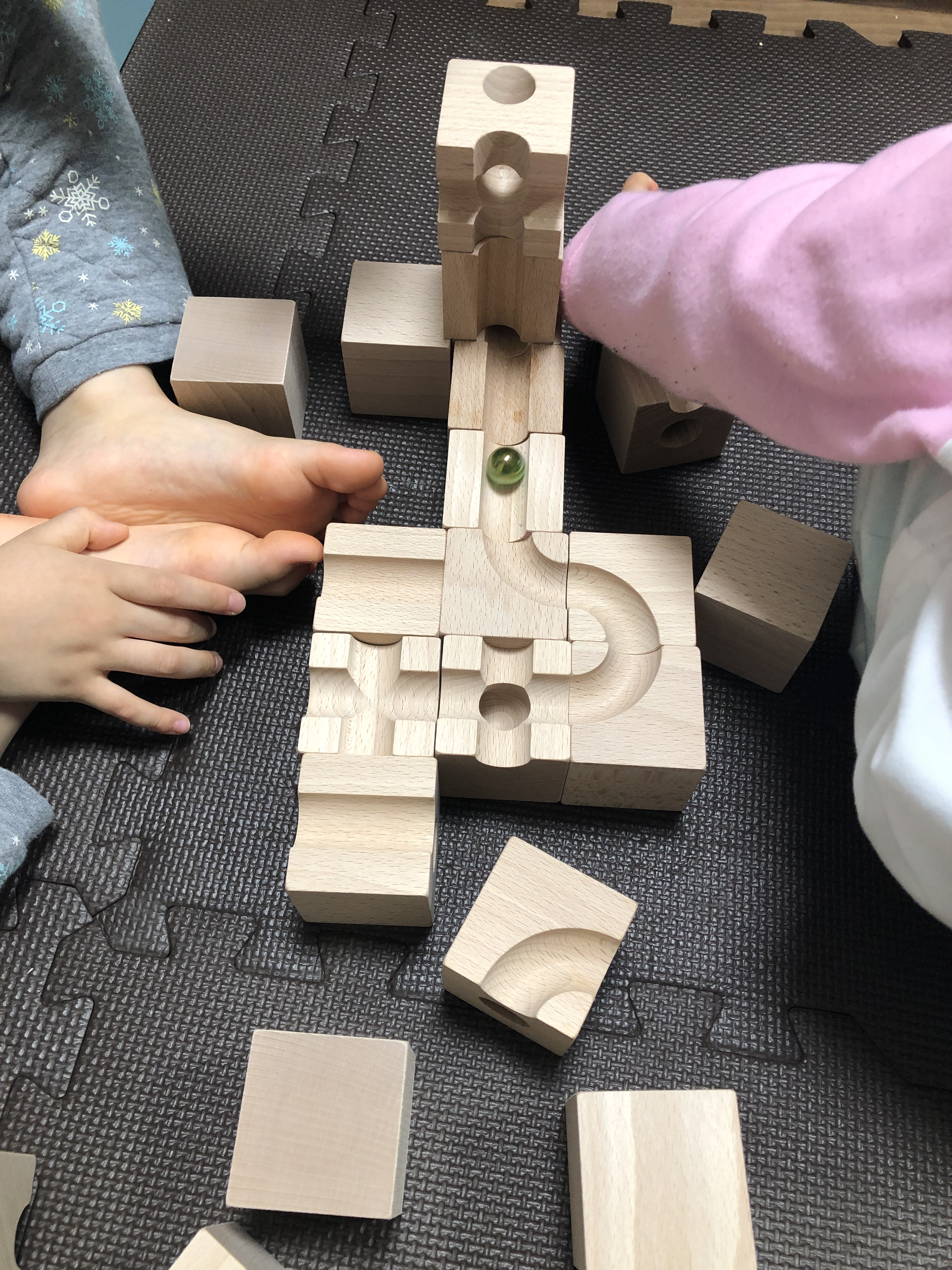 色んな形の木のブロックがあって穴が空いてたりビー玉が通れる道があったりと様々。